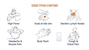 “Scrub typhus symptoms show high fever, eschar scab, body rash, swollen lymph nodes, and chest pain.”